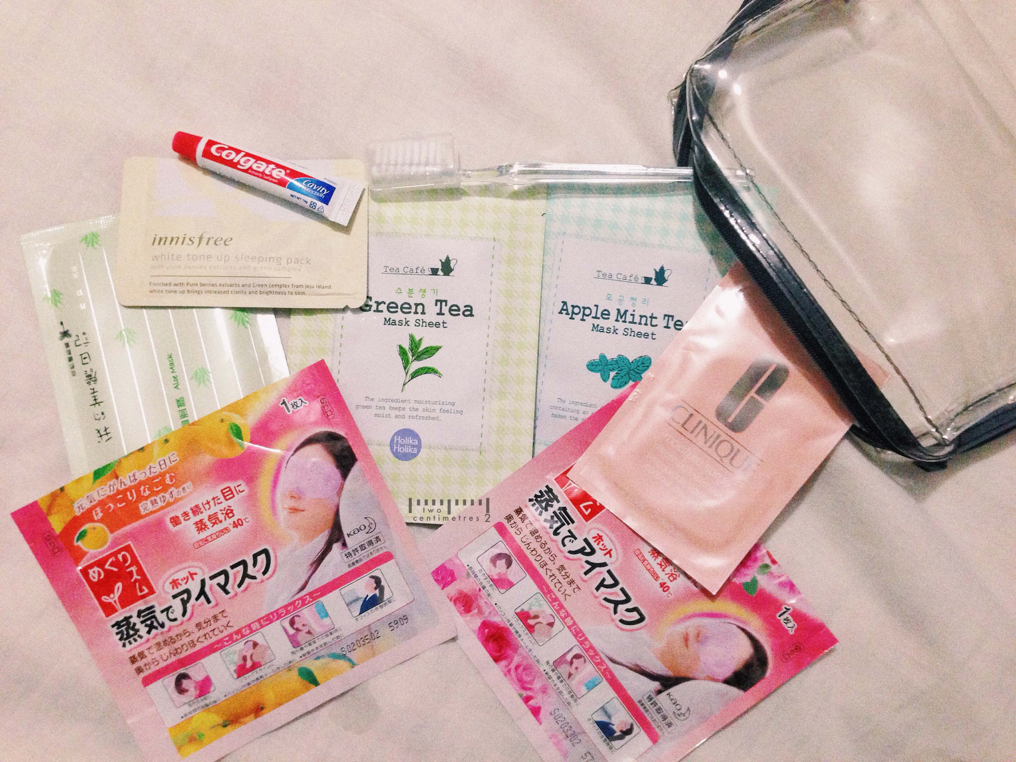 Featured are two Kao sleeping masks, Holika Holika sheet masks, Innisfree sleeping pack, My beauty Diary aloe vera sheet masks, under eye masks from Clinique as well as a toothbrush and some toothpaste.